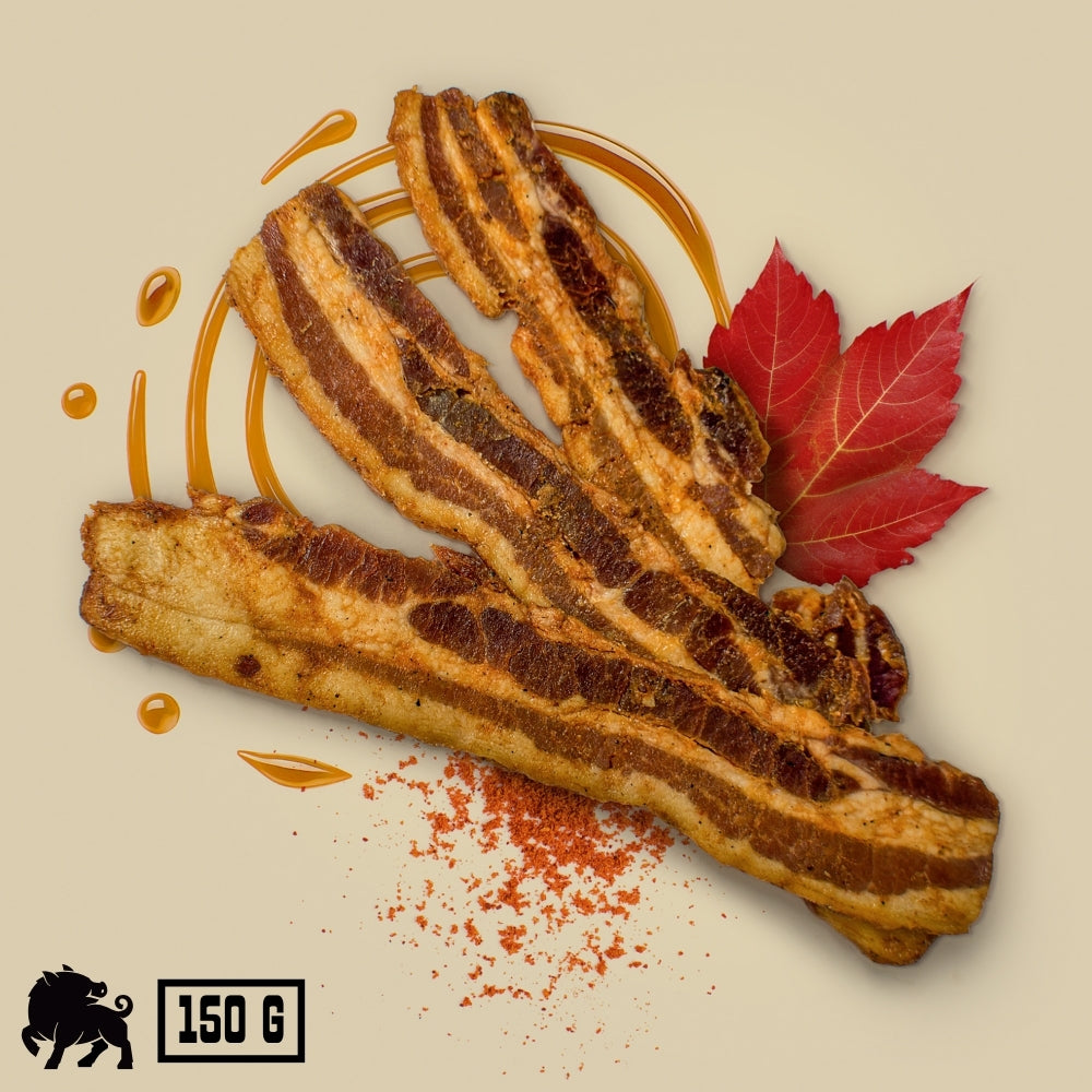 Herrlich getrocknete und geräucherte Bacon Strips mit süßem Ahornsirup-Geschmack. Unverschämt lecker. Und wie du es von uns kennst: hergestellt aus hochwertigem Fleisch vom Freilandschwein – ohne Antibiotika, Hormone oder anderen Mist. Packungsgröße: 150 g.